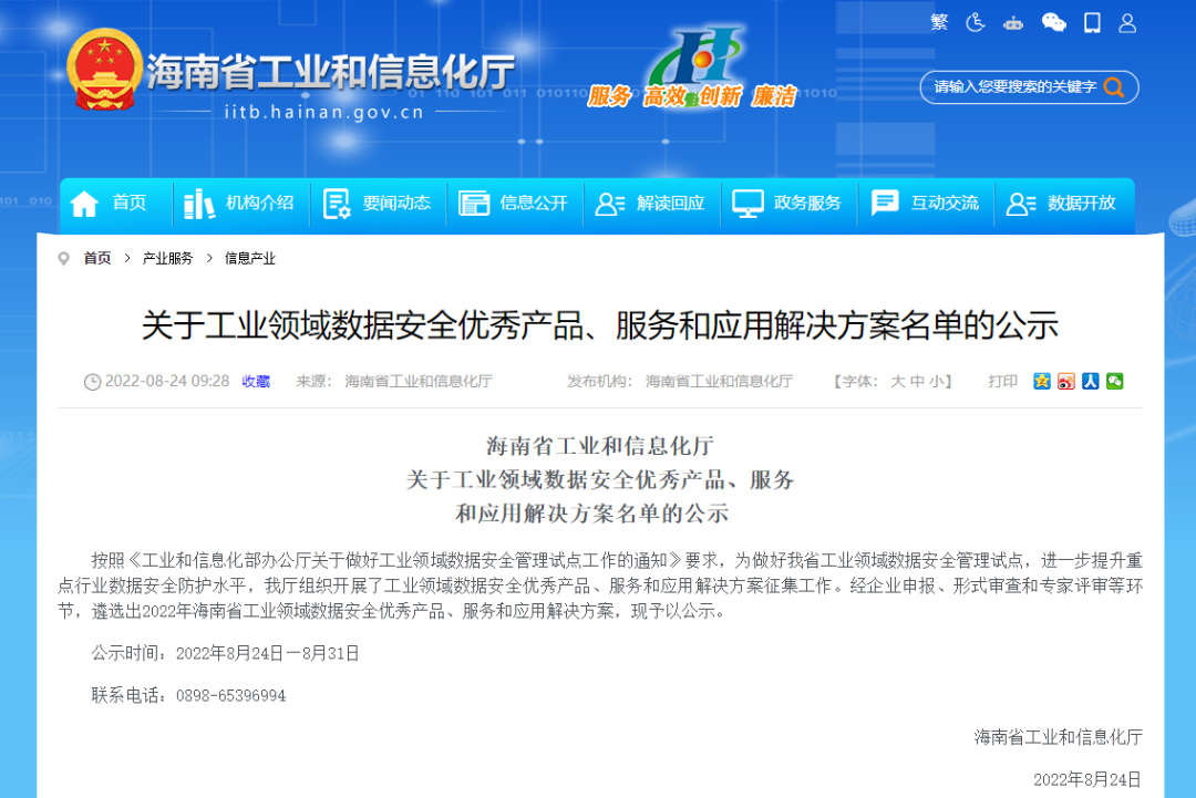 近日,海南省工業和信息化廳組織“工業領域數據安全優秀產品、服務和應用解決方案”征集活動,經企業申報、形式審查和專家評審等環節層層篩選,安恒信息成為唯一一家入選本次優秀產品、服務和解決方案所有名單的廠商,充分彰顯安恒信息在數據安全領域全方位的技術實力和廣泛的市場認可。