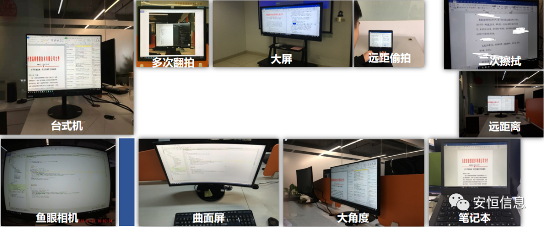 安恒EDR屏攝泄密溯源模塊具備極佳的魯棒性以及溯源的成功率,可針對臺式機(jī)、筆記本、顯示大屏、曲面屏、斜角度拍攝、魚眼相機(jī)拍攝、多次翻拍、遠(yuǎn)距離、部分屏、二次擦拭、圖片壓縮裁剪等多種環(huán)境進(jìn)行溯源取證。