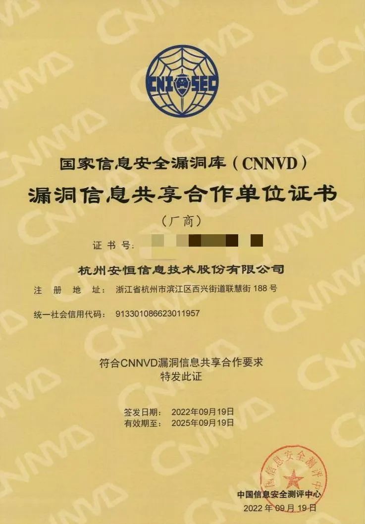 近日,國家信息安全漏洞庫(CNNVD)向安恒信息在內(nèi)的8家單位頒發(fā)首批“CNNVD漏洞信息共享合作單位證書”。