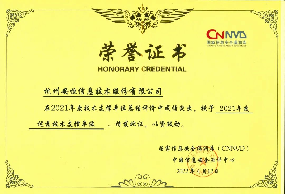自2014年成為首批入選國家信息安全漏洞一級(jí)支撐單位的廠商以來,安恒信息積極為CNNVD提交重要數(shù)據(jù)漏洞,多年來,憑借實(shí)力和豐富經(jīng)驗(yàn)先后獲得來自CNNVD的多項(xiàng)榮譽(yù)。2021年,安恒信息榮獲CNNVD頒發(fā)的“2021年度特殊貢獻(xiàn)獎(jiǎng)”和“2021年度優(yōu)秀技術(shù)支撐單位”,不斷支持國家漏洞庫的建設(shè),助力信息安全漏洞研究。