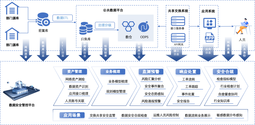 采集相關的安全數據,并進行處理和智能分析,從數據、接口、人員三個維度識別安全事件、形成態勢感知、進行預警通報。