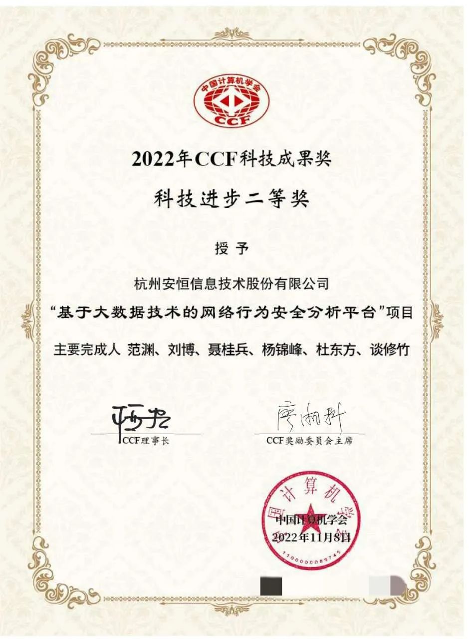 近日,中國計算機學會(CCF)發布了2022年度“CCF科技成果獎”評選結果,全國僅有30個項目獲獎。安恒信息申報的“基于大數據技術的網絡行為安全分析平臺”項目榮獲科技進步二等獎。這項科技界權威獎項是對安恒信息創新實力的再次肯定。