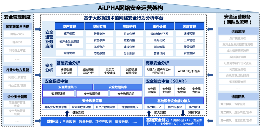 隨著企業信息化的不斷發展,逐漸呈現出人機物深度融合的網絡空間環境,這其中存在設備多樣異構、行為多跨場景、邊界多態模糊、威脅多源重構等復雜化趨勢,網絡攻擊面被無限放大。因此,研究利用大數據、云計算、人工智能等賦能“技術對技術、技術管技術”的安全威脅治理,解決攻防對抗能力不對稱難題,成為網絡強國必爭的技術高地。具體而言,如何統一處理設備端多源異構海量日志數據、如何政企企業全網絡行為的預警分析、如何對網絡攻擊行為進行自動化關聯推理以及如何對發生的安全事件進行快速阻斷等,是當前安全威脅治理面臨的四重技術難題。基于此,我們提出利用大數據、人工智能等技術實現網絡安全平臺類產品,為政企構建體系化安全運營方案。