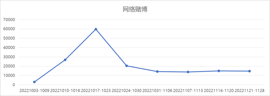安恒神盾局監(jiān)測(cè)發(fā)現(xiàn),近一個(gè)月前后,以中文為主要語(yǔ)言的涉賭網(wǎng)站數(shù)量激增,每周新增涉賭網(wǎng)站數(shù)量由3千上升至6萬,峰值時(shí)期平均每日新增近10000個(gè)賭博網(wǎng)站。