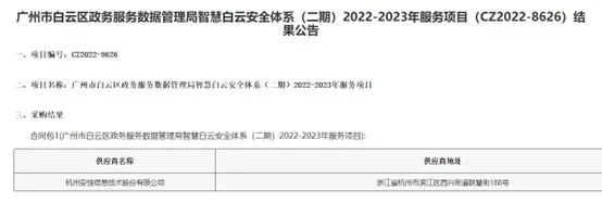 近日,安恒信息憑借自身技術和專業優勢,以及豐富的智慧城市安全建設經驗,成功中標廣州市白云區政務服務數據管理局智慧白云安全體系(二期)2022-2023年服務項目,項目金額超過2000萬。