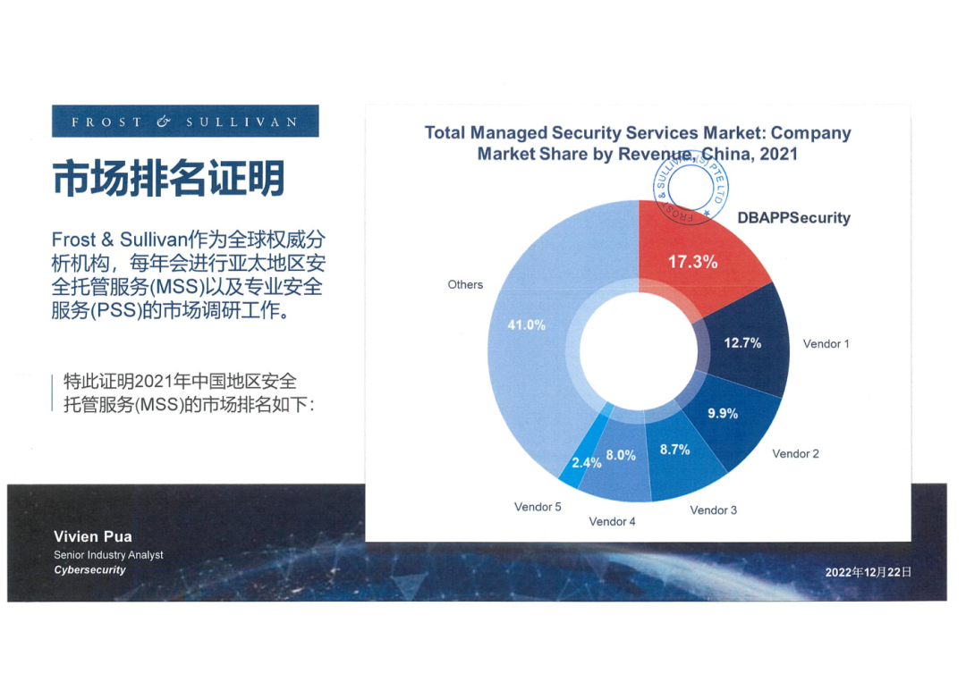 近日,Frost & Sullivan發布《Asia Pacific (APAC) Managed and Professional Security Services Market》報告(以下簡稱《報告》),對中國地區安全托管服務(MSS)進行了深入研究。《報告》顯示,安恒信息憑借技術優勢和專業服務,以17.3%的市場份額位列2021年中國地區安全托管服務(Managed Security Services,MSS)第一名。