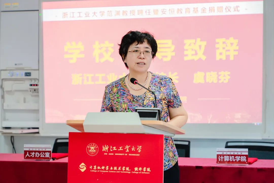 儀式上,虞曉芬副校長代表學校向安恒信息長期以來對浙江工業大學和計算機科學與技術學院、軟件學院發展的關心支持表示感謝,并向他們介紹了學校的基本情況。她指出,范淵董事長熱心高等教育事業,向學??犊栀Y,彰顯了企業家關心教育、回報社會的責任和擔當,并提出了未來雙方深入合作共同培養優秀網安人才的美好愿景。