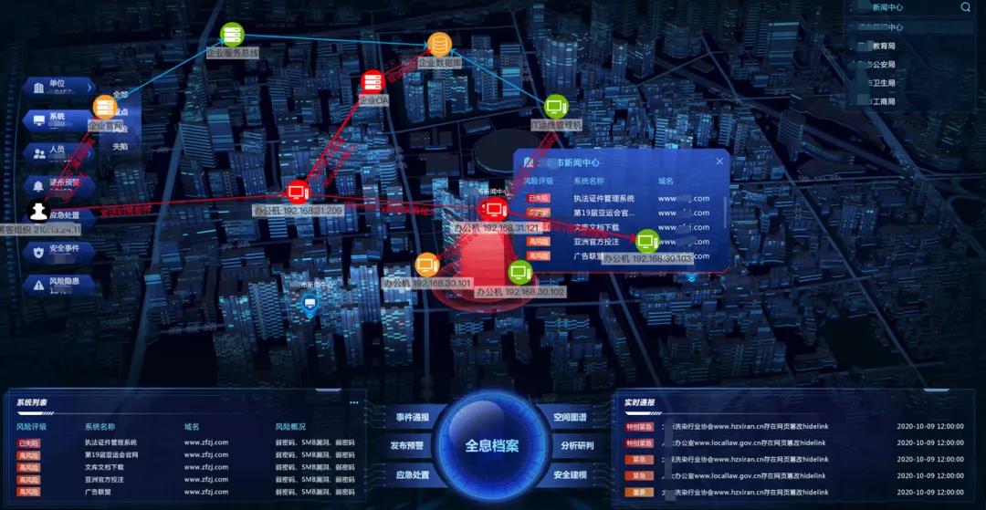 以網(wǎng)絡空間地圖可視化為基礎(chǔ),融入網(wǎng)絡空間關(guān)系、網(wǎng)絡空間資產(chǎn)數(shù)據(jù)、、網(wǎng)絡安全隱患、網(wǎng)絡安全事件、從單位、資產(chǎn)、系統(tǒng)、事件等維度豐富可視化表達,全面展示和描述網(wǎng)絡空間資源的分布和屬性,實現(xiàn)網(wǎng)絡空間要素的可視化表達。