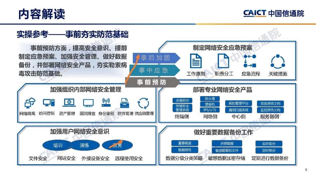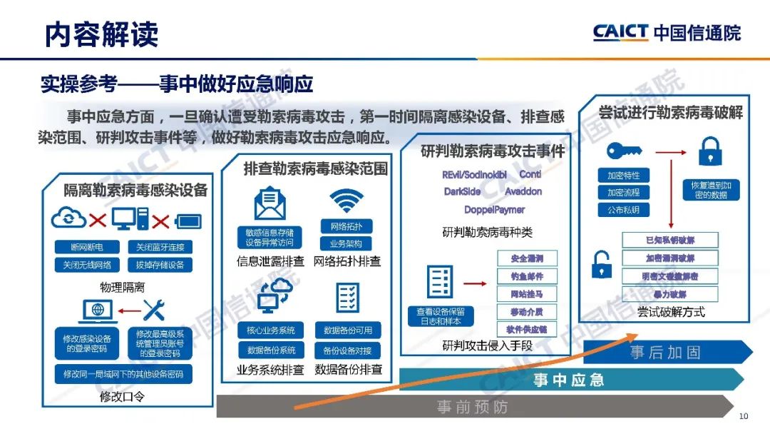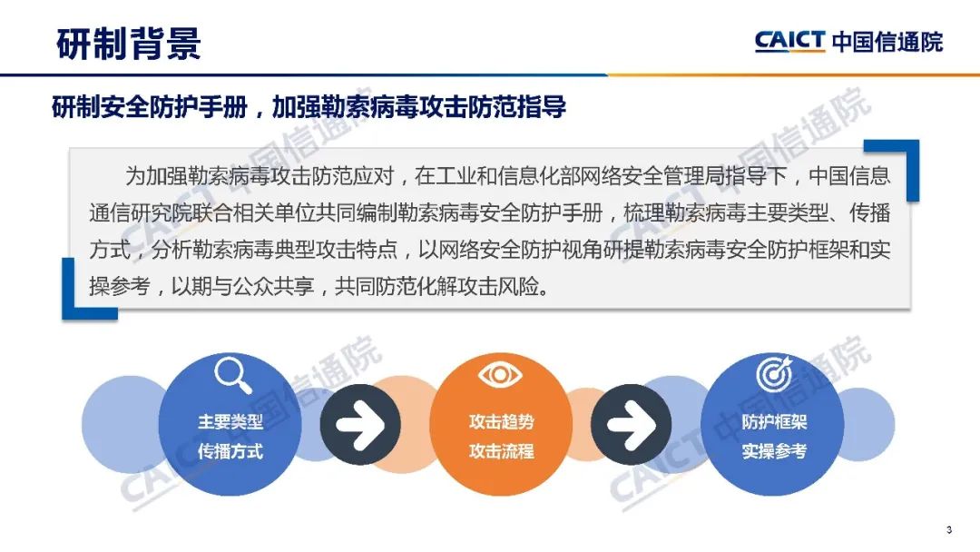 為加強勒索病毒攻擊防范應對,在工業和信息化部網絡安全管理局指導下,中國信息通信研究院(以下簡稱“中國信通院”)聯合行業七家單位共同編制《勒索病毒安全防護手冊》(以下簡稱“《手冊》”),梳理勒索病毒主要類型、傳播方式,分析勒索病毒攻擊特點和典型勒索病毒攻擊階段,聚焦事前預防,事中應急、事后加固三個環節,研提勒索病毒攻擊防范應對框架和實操參考,以期與公眾分享,共同防范化解攻擊風險。