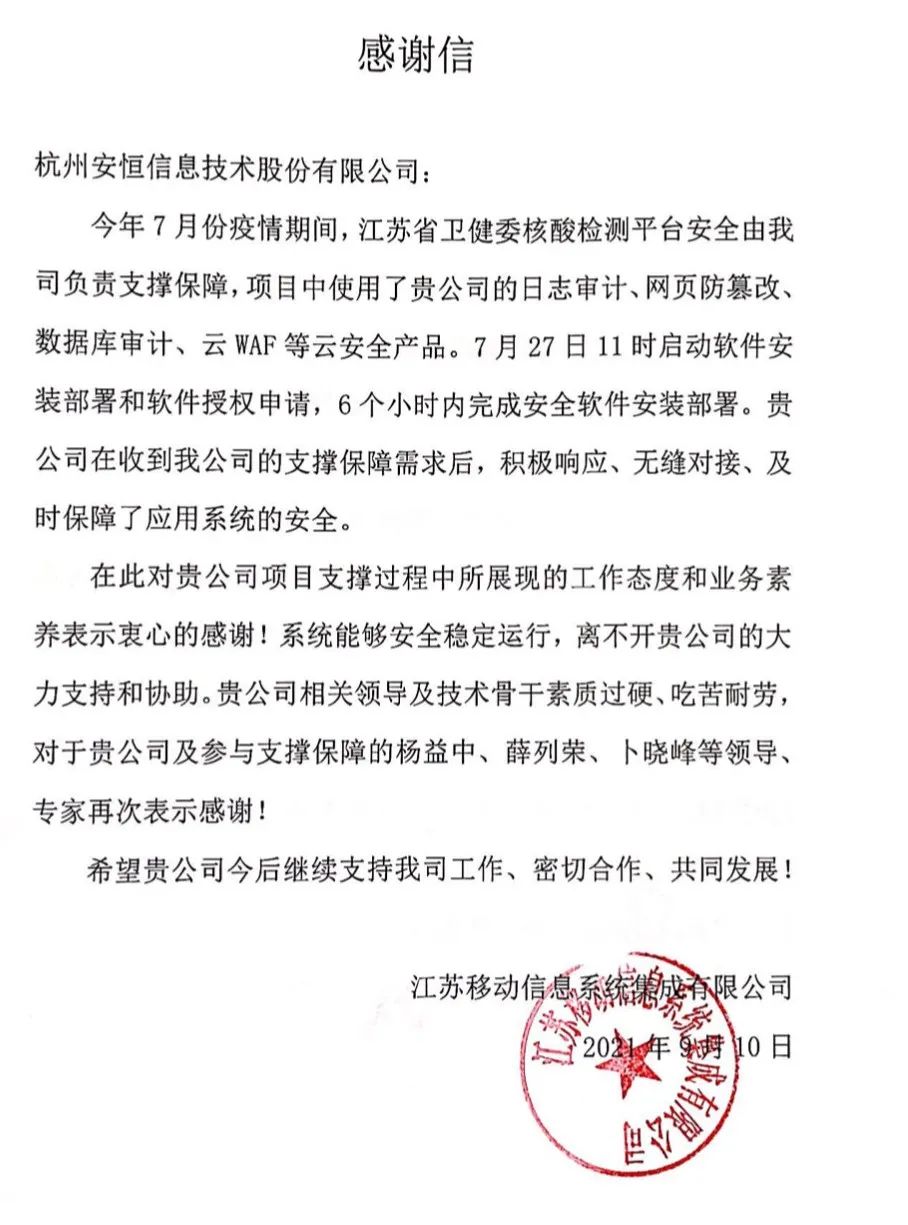 江蘇移動向安恒信息發來一封誠摯的感謝信,無論外部環境如何艱險,安恒人不怕苦畏難,始終和客戶站在一起的優秀服務者形象呼之欲出,贏得認可。在肩負抗疫社會責任的畫卷中,安恒信息再添光輝一筆。