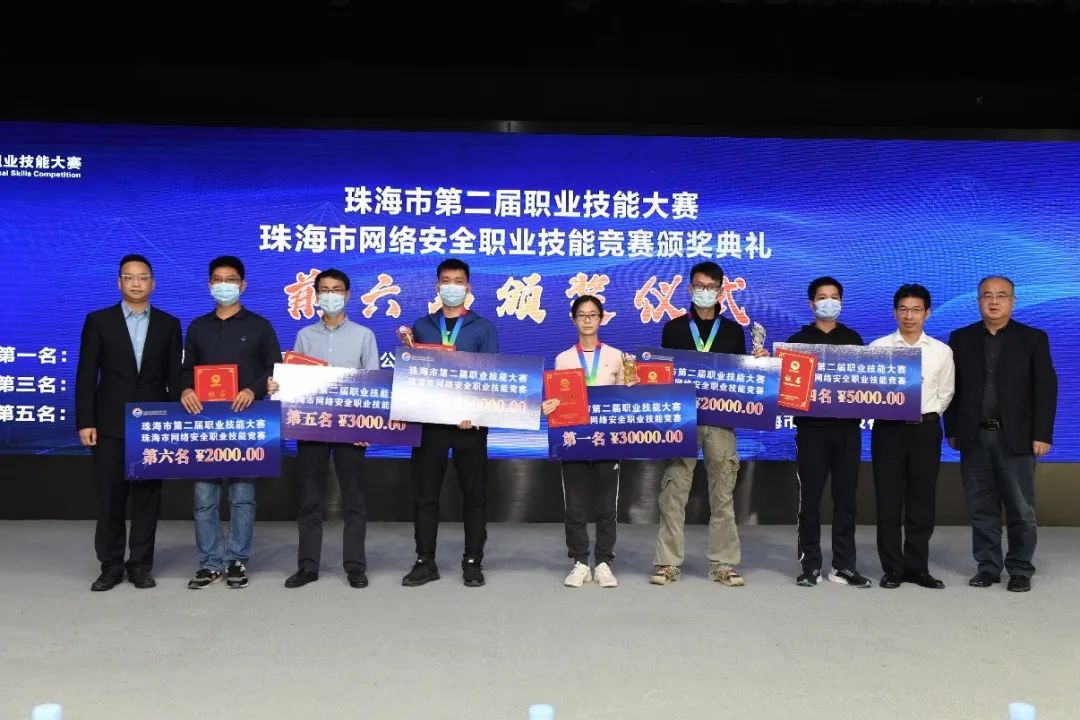 會(huì)上還舉行了珠海市第二屆職業(yè)技能大賽之珠海市網(wǎng)絡(luò)安全職業(yè)技能競(jìng)賽頒獎(jiǎng)典禮。珠海市委網(wǎng)信辦、珠海市職業(yè)訓(xùn)練指導(dǎo)服務(wù)中心、珠海市工業(yè)互聯(lián)網(wǎng)協(xié)會(huì)領(lǐng)導(dǎo)為獲得前六名的參賽選手頒發(fā)了證書、獎(jiǎng)杯及獎(jiǎng)金,前三名選手還被授予“珠海市技術(shù)能手”稱號(hào)。