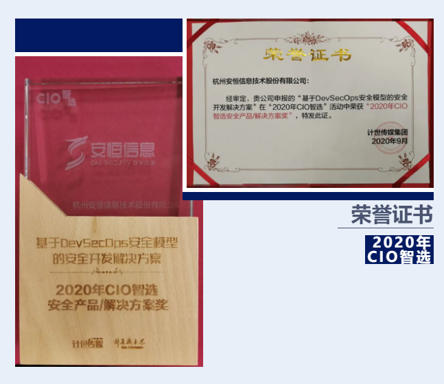 近日,中央專業媒體集團計世傳媒推出了“2020 CIO領航計劃”暨“復工復產復學”優秀案例征集大型活動”。安恒信息憑借DevSecOps安全模型的安全開發解決方案,榮獲「2020年CIO智選安全產品/解決方案獎」,共同入選的還有華為、釘釘、京東物流等企業。