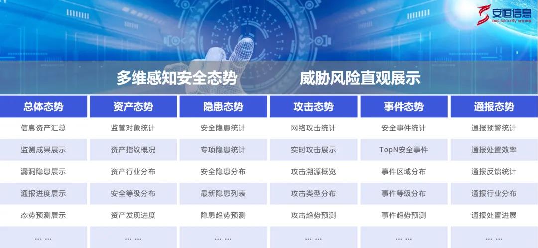 安恒信息態勢感知平臺無論是在多源異構數據采集、海量數據存儲、安全事件溯源分析等核心技術方面,還是在安全態勢可視化展示、多場景業務監管等實際應用方面都具備先發優勢。能力表現為以下幾點: