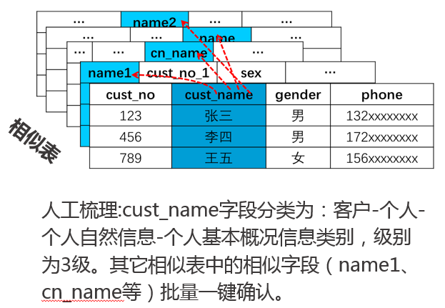 特性:采用無監督的聚類算法,將相似字段/表聚合在一起實現信息整合;在梳理向導功能的輔助下,用戶僅需修改其中一項的分類分級信息,即可批量自動覆蓋其他相似字段/表的結果,提升人工梳理效率。聚類算法在AiSort的版本迭代中持續優化,聚焦于提供更具實際業務描述能力的信息整合手段,讓梳理人員在盡可能短的時間內準確判斷當前字段的實際分類和實際分級。