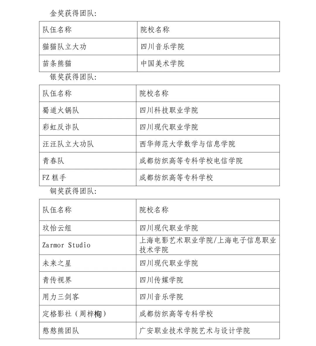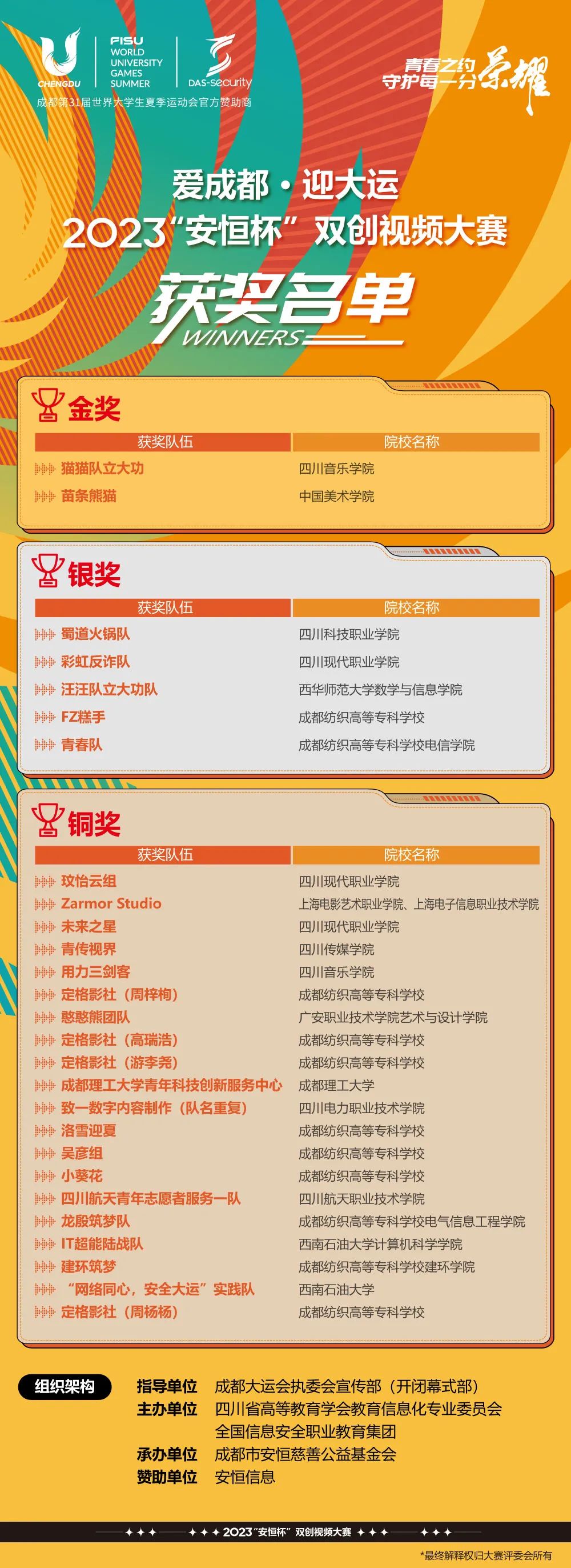 為宣揚大運精神、普及青年網絡強國意識,愛成都·迎大運2023年“安恒杯”雙創視頻大賽自6月26日至7月25日進行了為期一個月的作品征集,共收到來自全國36所院校提交的有效作品89個。最終,經過11位專家為期一周的評審,共產生2支金獎團隊、5支銀獎團隊、20支銅獎團隊,現公布名單如下: