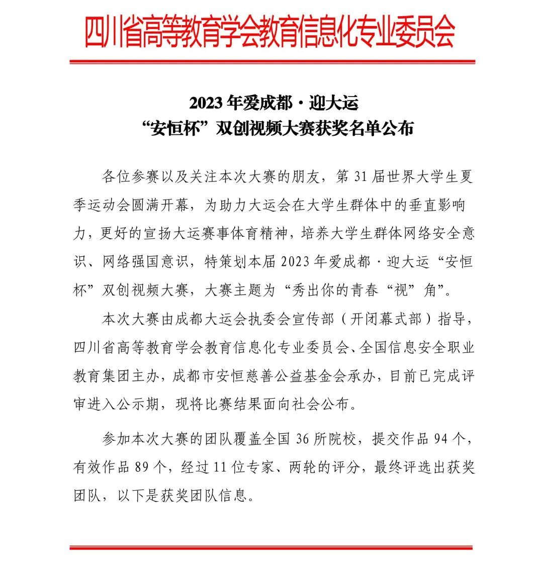 愛成都·迎大運2023年“安恒杯”雙創視頻大賽獲獎名單公布