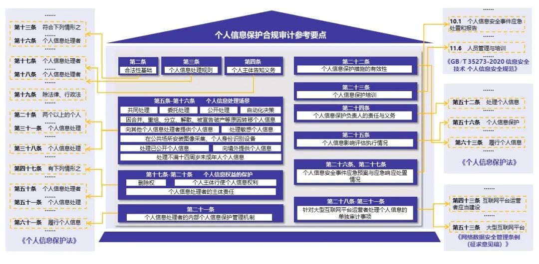 如上圖不難看出,《要點》中相關參考條例與《個人信息保護法》《網絡數據安全管理條例(征求意見稿)》《GB/T 35273-2020 信息安全技術 個人信息安全規范》中相關要求均有對比映射關系,從不同條款中都與現存的國家法律法規、標準要求進行了銜接,為個人信息保護合規審計國家層面的標準要求落點提供了細化補充與深度擴展。
