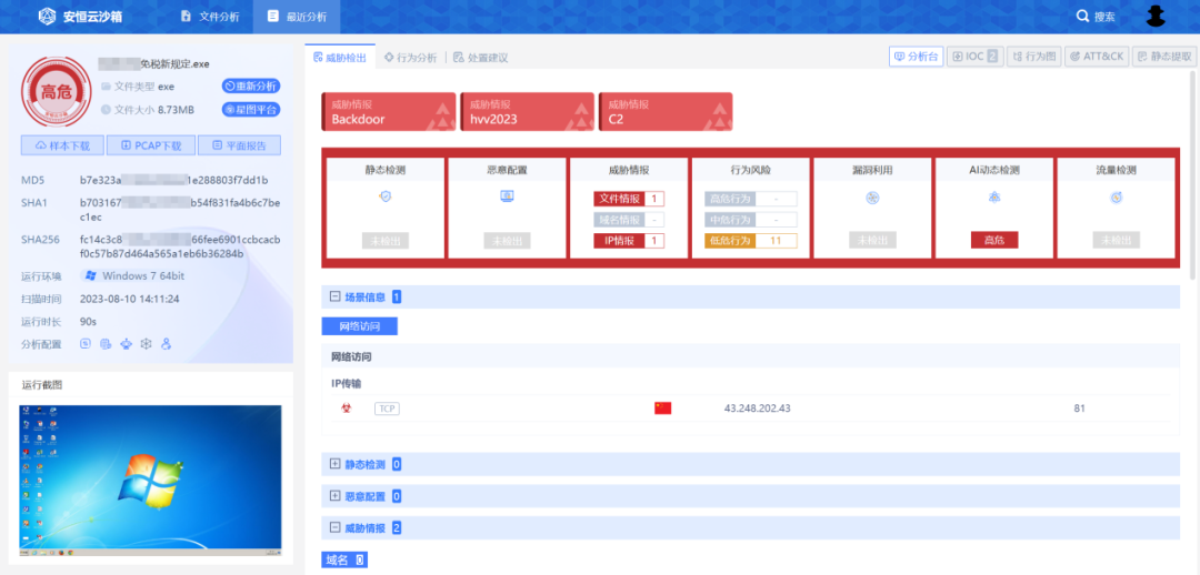 安恒云沙箱有助于快速分析釣魚相關樣本,方便分析人員迅速定位關鍵信息,掌握樣本回連地址等分析人員最關心的惡意樣本核心內容,幫助分析人員分析出IP/域名/端口/URL,實現(xiàn)快速封禁。