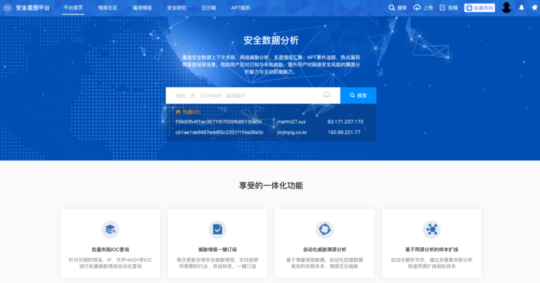 安全星圖平臺,助力安全運維人員第一時間獲知IOC準確詳情,在釣魚比賽中搶占先機!平臺還支持批量IOC查詢,針對大量IOC分析需求,提供強力支撐。