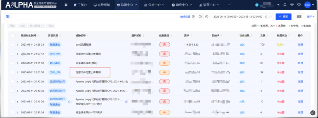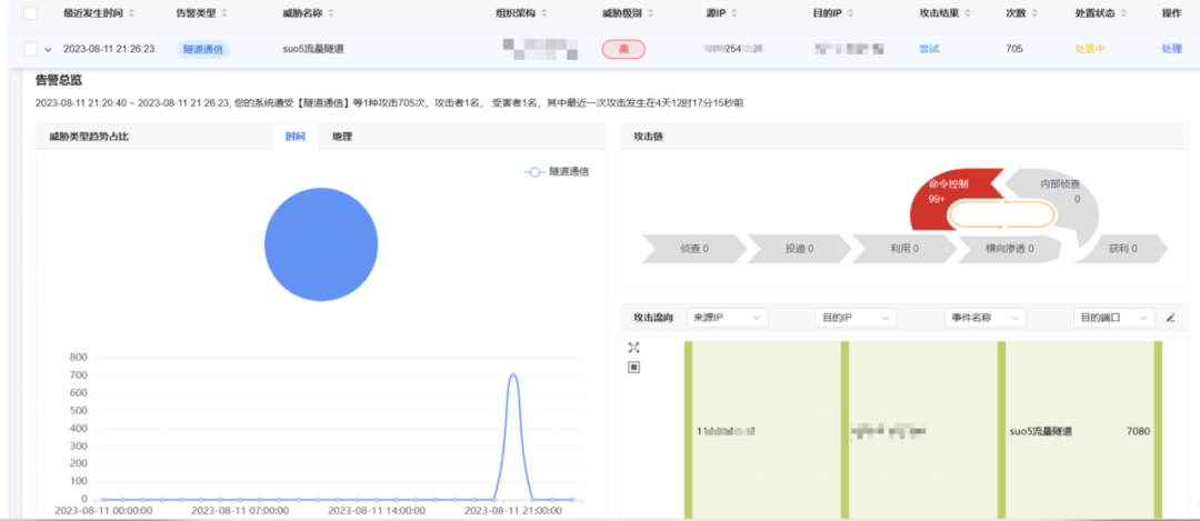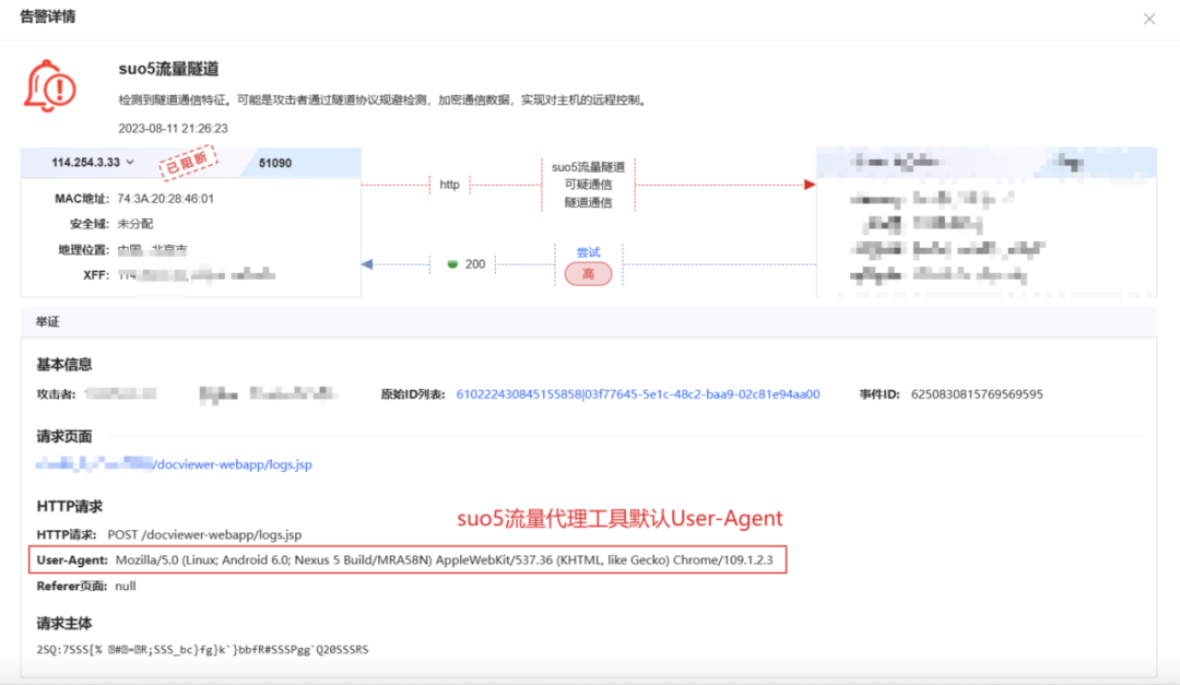 2023-08-11 21時20分,平臺出現suo5隧道通信告警,告警源IP為114.254.3.33,被攻擊系統為xx集團xx綜合辦公系統,一俠士發現后及時提報了該事件。