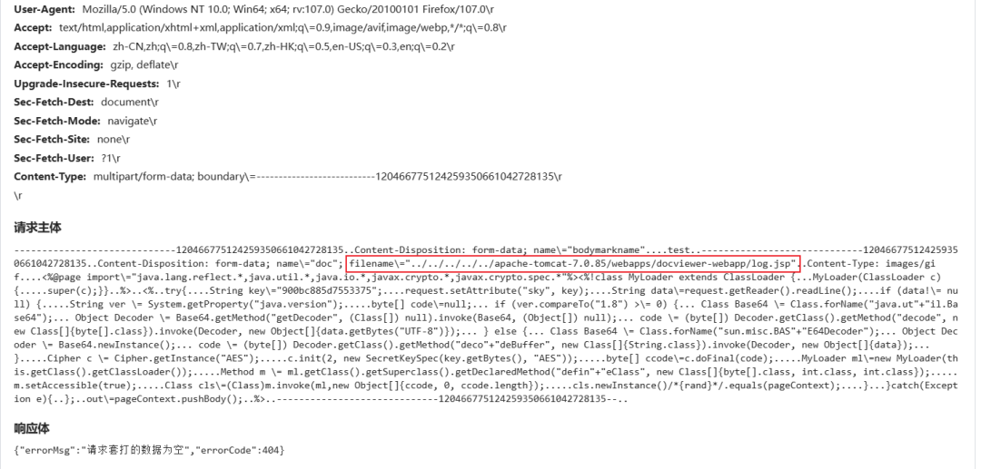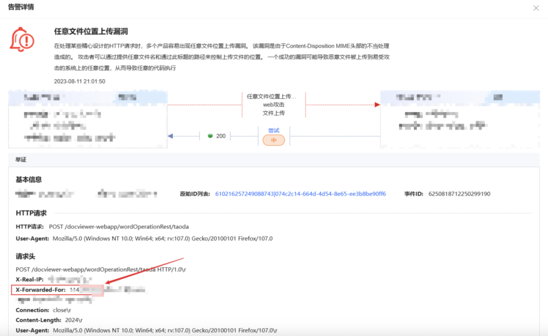 進一步對攻擊和受害IP的相關告警進行分析,發現受害IP在suo5隧道通信之前,還遭受了多個來源IP的多種攻擊行為,包括任意文件上傳。來源IP為負載均衡,從XFF中可以看到文件上傳行為來自于114.254.3.8,與suo5通信告警的源IP同C段,大概率為同一攻擊隊,告警時間為2023-08-11 21:01:50。查看請求體發現上傳的文件名稱為log.jsp,并非suo5代理通信的logs.jsp。