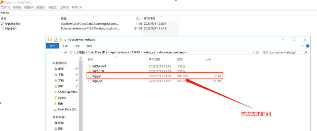 此時只能通過上機溯源,通過主機上的信息理清攻擊鏈條。登錄主機后,首先進入web目錄,定位惡意文件,可以看到log.jsp和logs.jsp均存在于web目錄下,說明114.XX.X.8的webshell上傳成功。推斷攻擊者利用xx綜合辦公系統的任意文件上傳漏洞上傳天蝎webshell,再通過webshell加密上傳suo5代理隧道工具,進而發起內網橫向掃描。