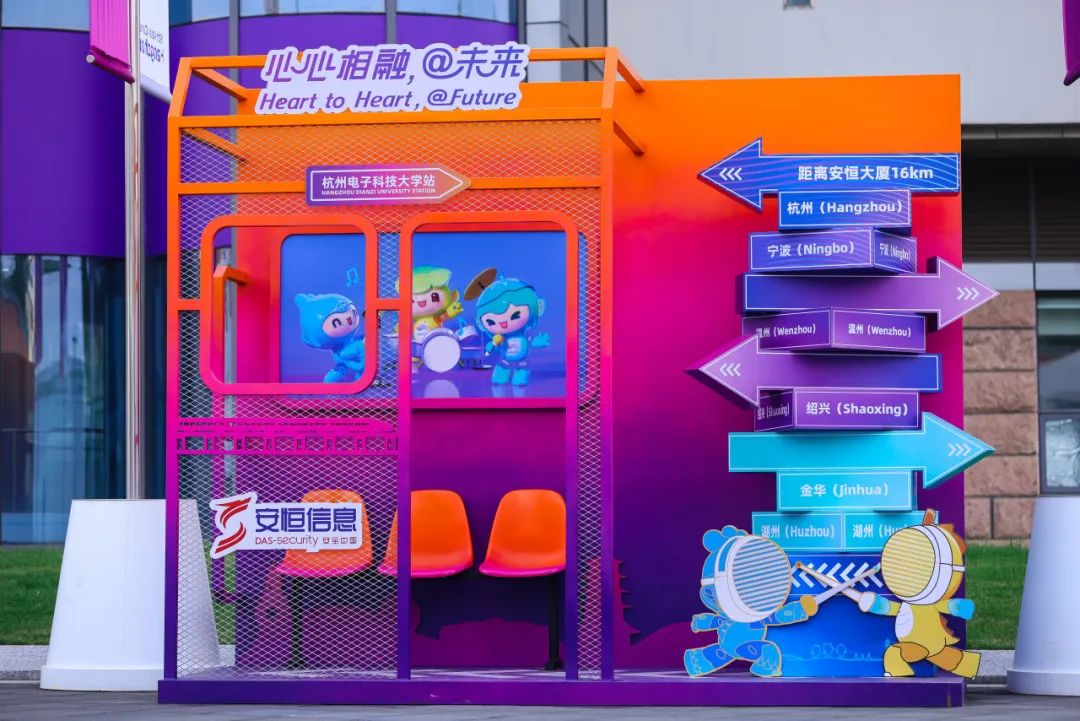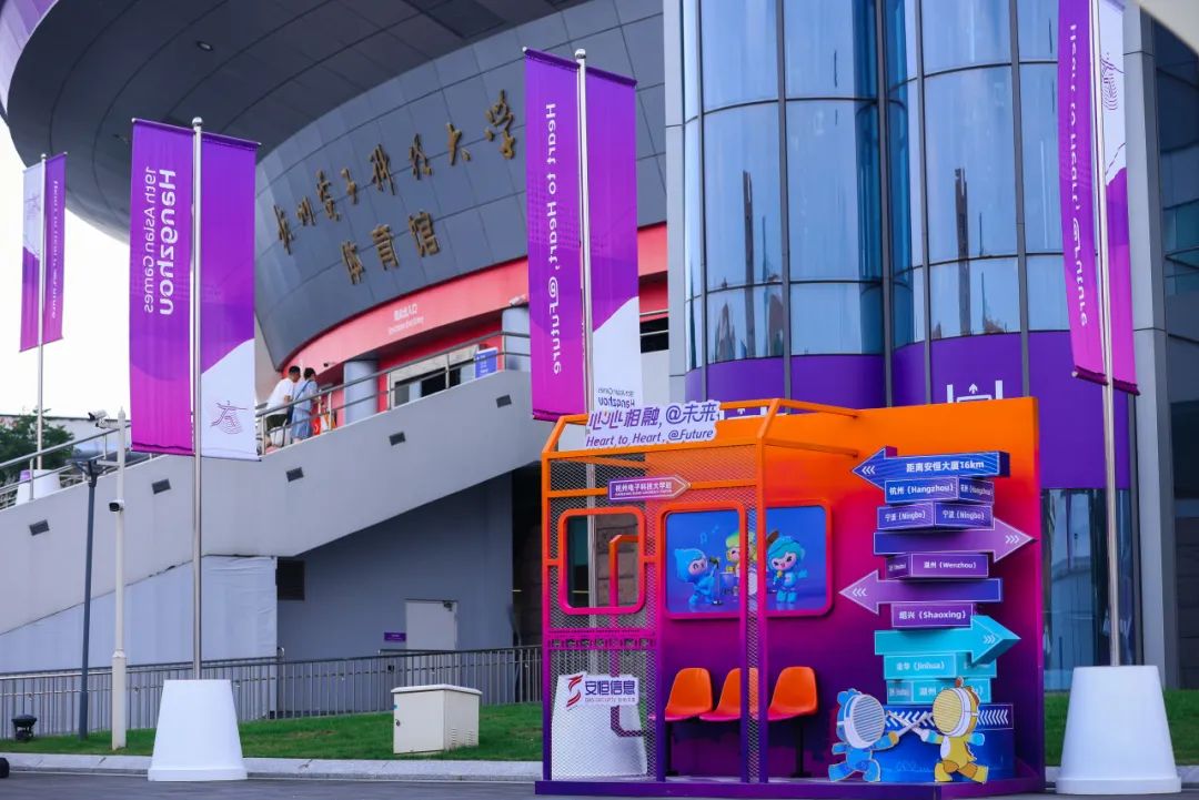 場館位于學校教學區西區地塊,距離亞運村約23KM,距離安恒大廈16KM。安恒信息在場館門口專設了打卡拍照點,以車站為整體設計理念,設置了座椅、路標等趣味物品,讓來往觀賽者在此合影留念,記錄與亞運的點點滴滴。