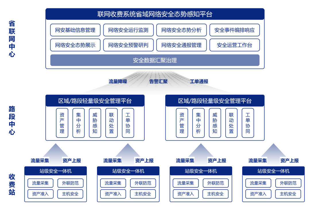 ?區域/路段中心及ETC發行方建設與省中心態勢感知系統級聯的二級態勢感知系統,負責本路段范圍內路段中心及各收費站(ETC發行單位及發行網點)的網絡安全風險感知與處置。