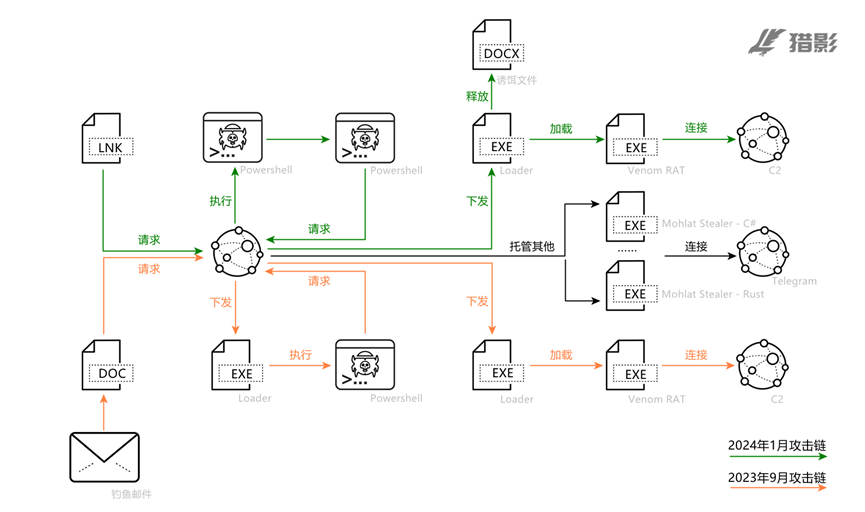 釣魚郵件附件DOC文件,帶有惡意宏代碼,運行后請求遠程服務器,下載用于執行Powershell的EXE文件,Powershell指令執行后,進一步下載Loader,最終在內存解密加載Venom RAT。