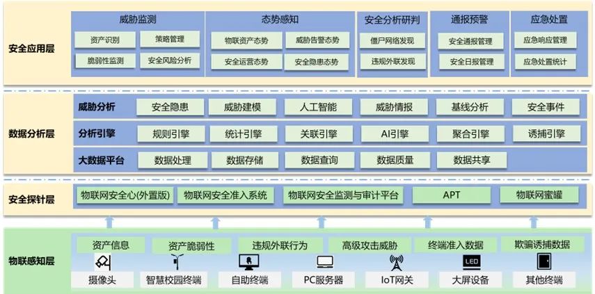面向高校智慧物聯(lián)網(wǎng)應(yīng)用場(chǎng)景,以保護(hù)學(xué)校物聯(lián)網(wǎng)資產(chǎn)與網(wǎng)絡(luò)為目標(biāo),以物聯(lián)網(wǎng)安全感知與管理平臺(tái)為核心,結(jié)合不同維度的安全探針,構(gòu)建高校智慧物聯(lián)網(wǎng)絡(luò)整體安全防護(hù)體系。技術(shù)構(gòu)架分為如下四個(gè)層級(jí):