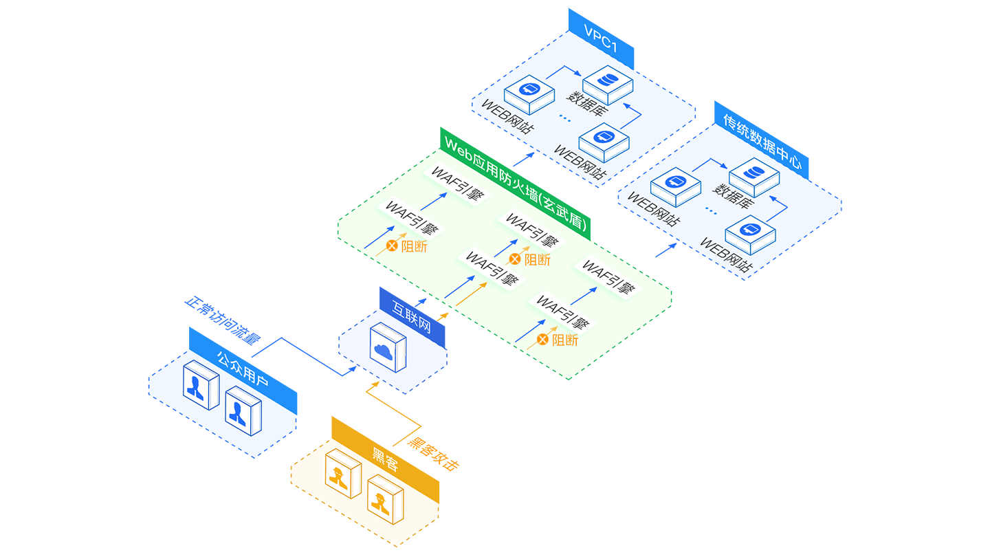 多種防護策略,精準防護SQL注入、跨站腳本、網頁木馬、信息泄露、WebShell上傳、第三方組件漏洞、CSRF跨站請求偽造、盜鏈等網絡攻擊。